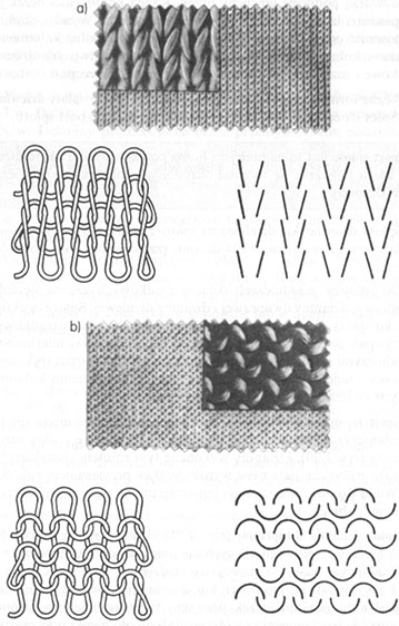 Rysunek. Splot dzianiny lewoprawej: a) strona prawa, b) strona lewa.